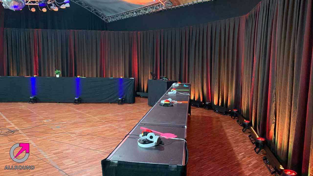 Mit unserem flexiblem Pipe&Drape System errichten wir in wenigen Minuten Verkleidungen mit schwarzem Bühnenstoff. Diese können durch vorhandene Roll-Ups oder Messewände sowie atmosphärischer Beleuchtung ergänzt werden.