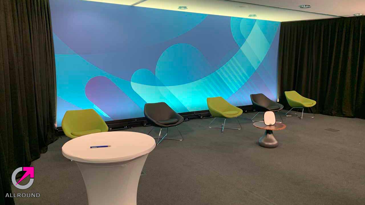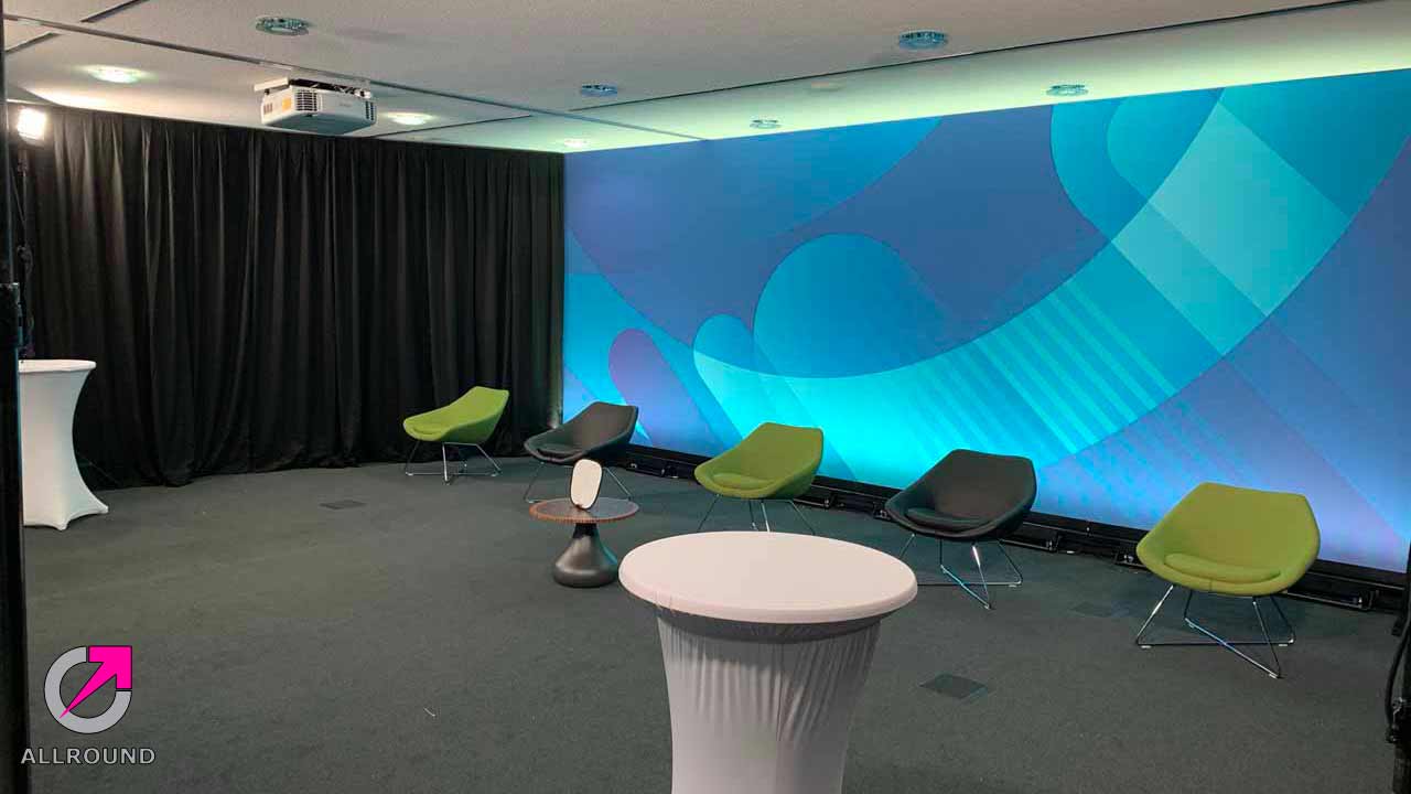 Der nächste Schritt sind unsere Textilwände, die mit einem bedruckten Stoff speziell für Ihr Event gebaut werden. Natürlich sind auch beide Systeme kombinierbar.